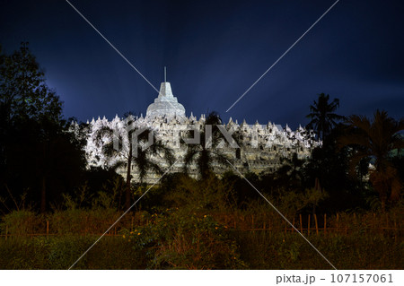 ライトアップされた夜のボロブドゥール寺院(インドネシア・ジャワ島)