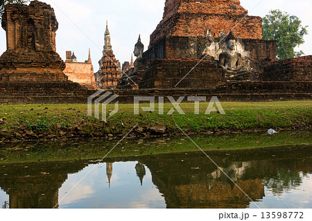 タイ北部の古都スコータイ 世界文化遺産のスコータイ歴史公園内のワットマハタート遺跡と池の水鏡