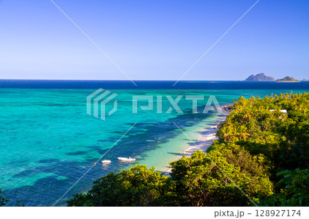 オセアニア フィジー共和国ビティレブ島の西の沖合いママヌザ諸島マナ島の展望台から眺めるノースビーチ