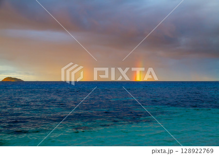 オセアニア フィジー共和国ビティレブ島の西の沖合いママヌザ諸島マナ島のノースビーチと水平線の虹の夕景