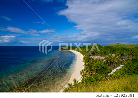 オセアニア フィジー共和国ビティレブ島の西の沖合いママヌザ諸島マナ島の展望台から眺めるノースビーチ