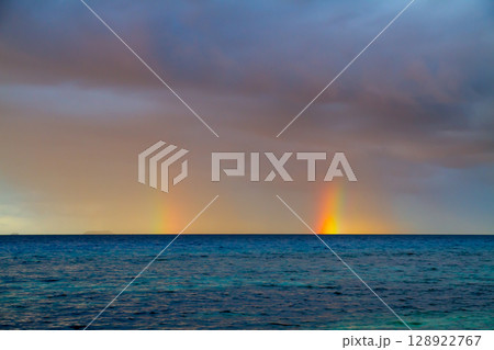 オセアニア フィジー共和国ビティレブ島の西の沖合いママヌザ諸島マナ島のノースビーチと水平線の虹の夕景