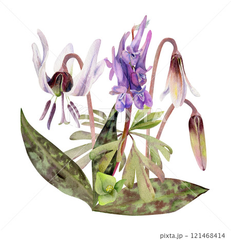 Spring forest flowers, white erythronium trout lily buds, spotted leaves, purple corydalis vetch orchid hand drawn in watercolor. Botanical isolated illustration for wedding, florist shop, stationery