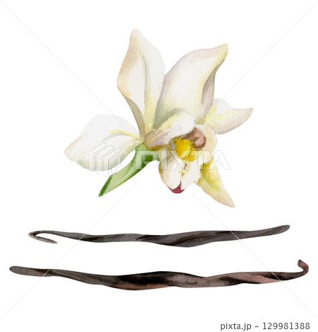 Vanilla orchid flower bloom, seed pod, natural spice. Isolated tropical plant illustration hand drawn in watercolor. Gourmet flavor branding, botanical decor, artisanal dessert design, aromatherapy.