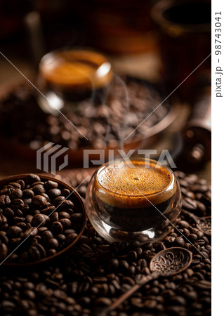 Closeup of pouring hot espresso coffee into a cup by Generative AI
