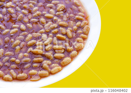 Baked beans in tomato sauce in a plate. Isolated on white background, Top view.