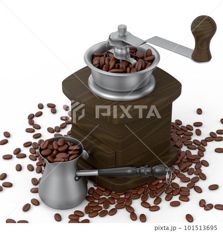 Manual wooden coffee grinder and Turkish cezve coffee maker with coffee beans