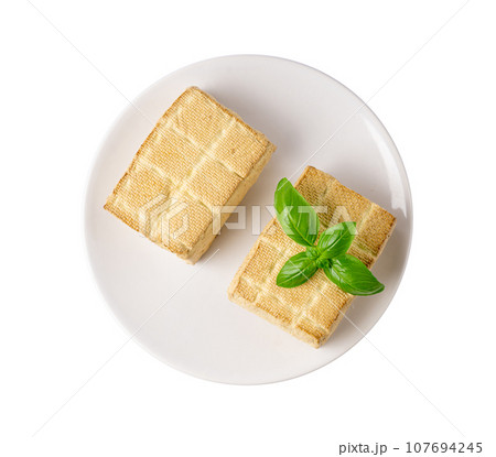 Tofu Cheese Isolated, Smoked Vegan Cheese Slice, Sliced Soya Bean Curd, Soy Protein or TSP