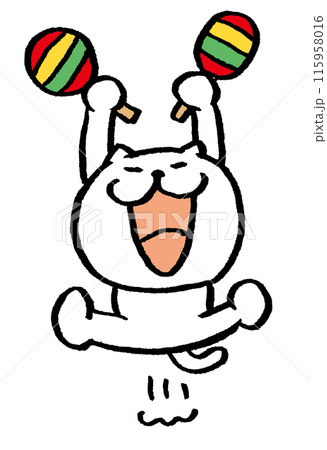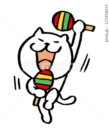 マラカスを振ってノリノリなかわいいねこのキャラクターのデフォルメイラスト
