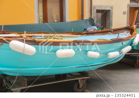Traditional wooden fishing boat resting near colorful coastal building. Mediterranean lifestyle, maritime culture and travel atmosphere, Italy, Manarola