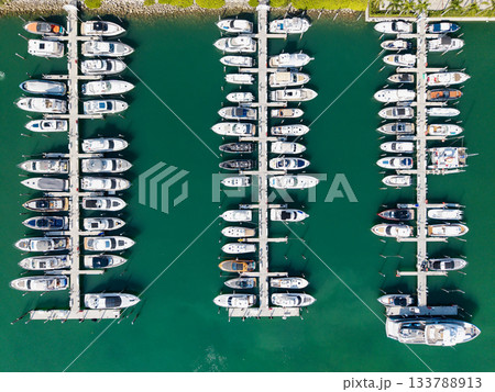 Top view of luxury yachts docked at marina. Boats and sailboats line the scenic seashore.