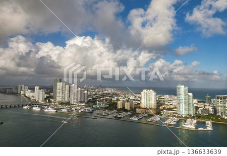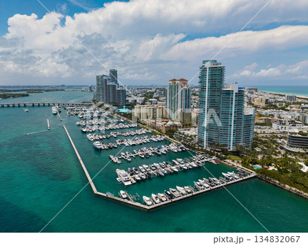 Miami marina with yachts and sailboats. Miami marina and turquoise ocean. Miami seascape aerial view on south beach shore.
