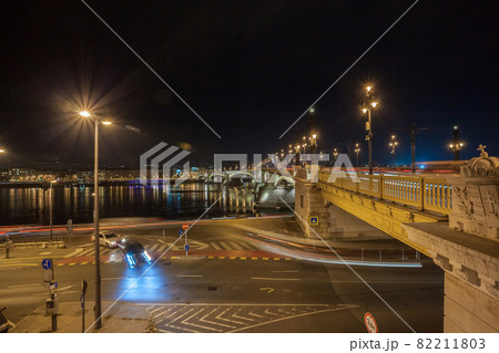 View of Margaret Bridge illuminated at night in Budapest, Hungary
