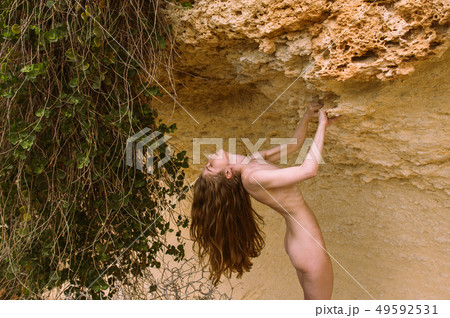Young naked girl posing in cleft on rocks