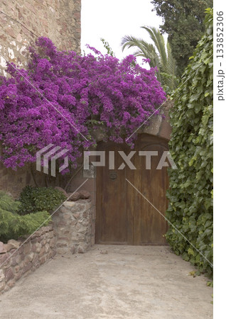 entrance door decorated with plants and flowers