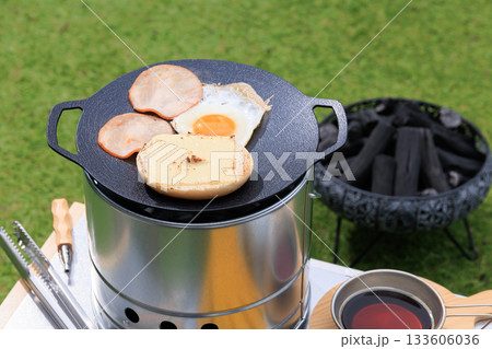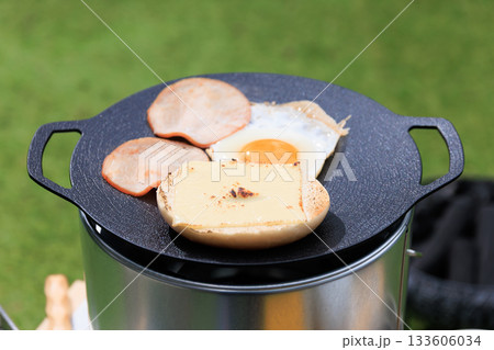 黒いマルチグリドルと具材のクローズアップ、芝生の緑を背景に