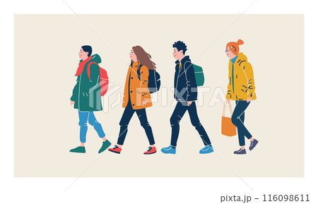 Four stylized people walking side side. Diverse group showing casual fashion, carrying bags, content expressions. Trendy individuals stroll, urban casual attire, youthful multicolored coats