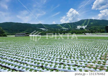 初夏の菅平高原と広がる高原野菜畑の空撮