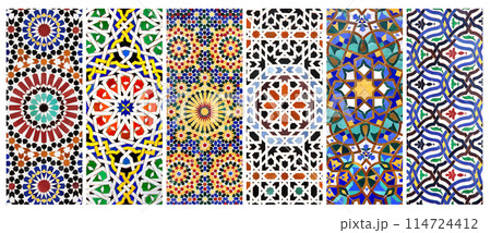 Set of vertical or horizontal banners with detail of ancient mosaic walls with floral and geometric ornaments. Collection of backgrounds with traditional iranian tile decorations