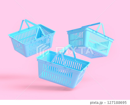 Set of flying plastic shopping basket from supermarket on monochrome background. 3d render concept of online shopping and black Friday sale
