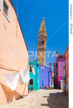 カラフルな建物の背後にそびえる古い教会の尖塔 (イタリア、ブラーノ島)