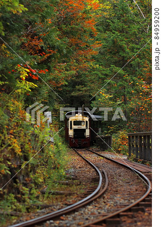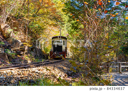 長野県_赤沢自然休養林の中を走り抜ける森林鉄道のトロッコ列車