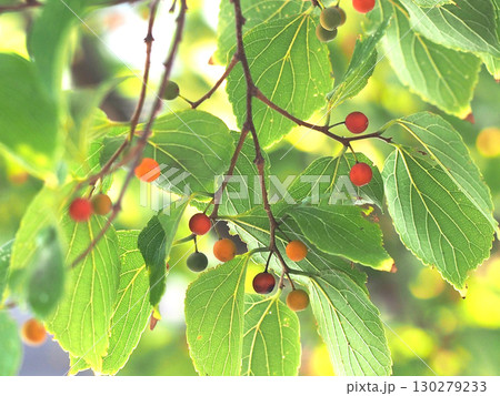 カラフルなエノキの実のクローズアップ(色付き始めた実をつけた榎の樹)