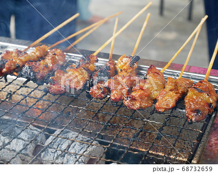 KUALA LUMPUR, MALAYSIA -AUGUST 17, 2018: Malaysian famous traditional food called sate. Meat or chicken marinated with mix spices and grill using hot charcoal. Grill in action.