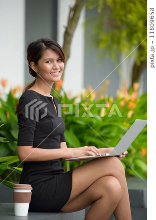 Successful young Malay business woman using laptop along promenade during break time