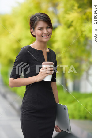 Successful young Malay business woman with coffee cup and laptop along promenade during break time