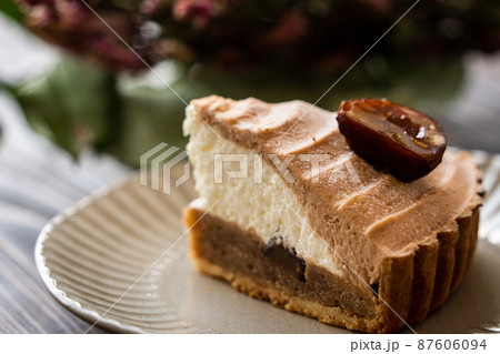 木の皿に乗ったマロンと抹茶のカップケーキ