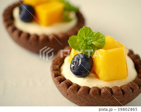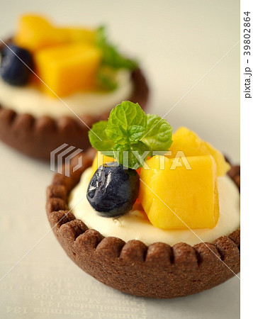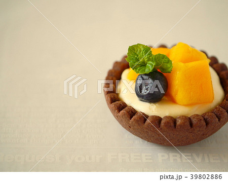 ココアカップのマンゴータルトレット コピースペース (ハイアングル)