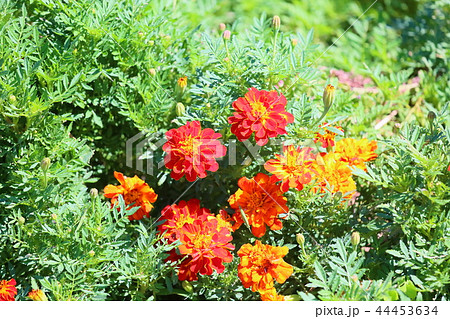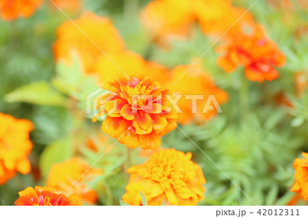 Tagetes patula French marigold in bloom, orange yellow flowers,