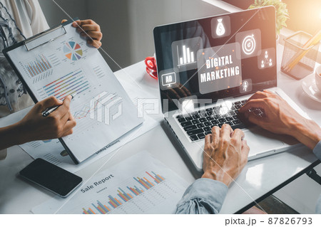 Digital marketing technology concept, Businessteam discussing data on office desk with VR screen digital marketing icon on office desk, Internet, Online, Search Engine Optimisation..