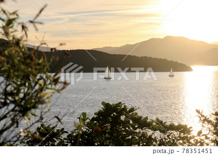 夕焼けに染まるリアス式海岸の沖に浮かぶヨット【ニュージーランド】