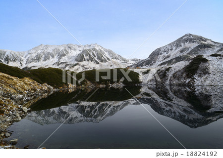 初雪の立山を映すみくりが池