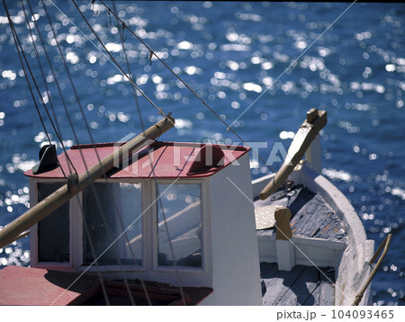 エーゲ海に浮かぶ小さな漁船の船首と青い海