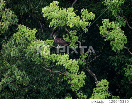 水辺のナンキンハゼの枝に止まる猛禽類ミサゴ