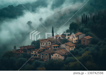 The morning fog is slowly lifting and revealing a small Italian village perched on a hill and surrounded by trees