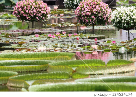 大倫の花が水面に浮くように咲く睡蓮ー参