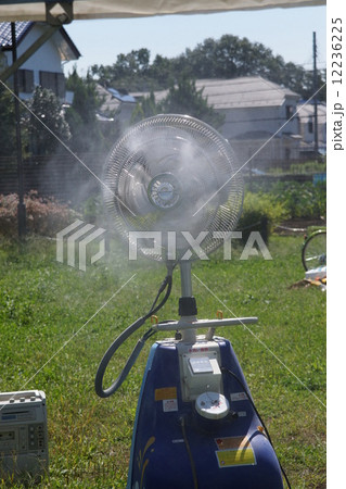 夏の建設土木工事現場で熱中症対策に使われるミストの送風機