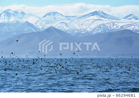 知床の山並みとミズナギドリの群れ(北海道・羅臼沖)