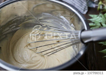 ホイッパーで混ぜたマフィンの生地 ホットケーキミックスで作るお菓子