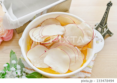 生地とサツマイモのスライスを混ぜる