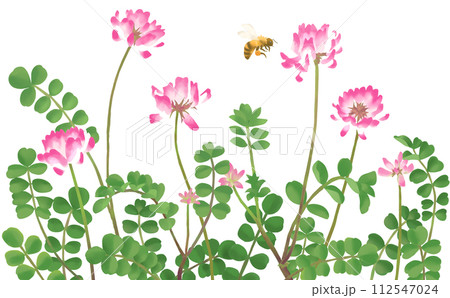 ミツバチが飛ぶれんげ畑 水彩タッチイラスト