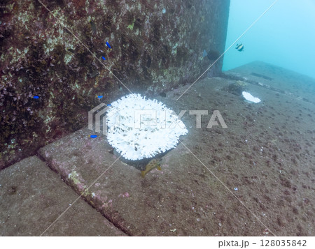 サンゴの白化現象と美しいヨゴレヘビギンポの幼魚。 ヒリゾ浜中木南伊豆町伊豆半島静岡県2024