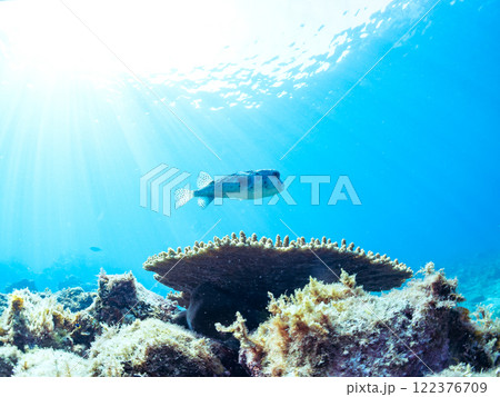 白化現象のサンゴと美しいハリセンボン(ハリセンボン科)他。ヒリゾ浜中木南伊豆町伊豆半島静岡県2024