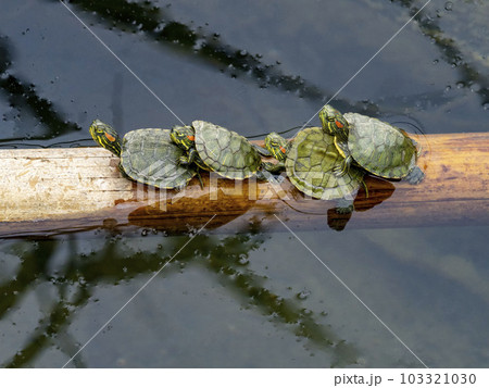 流木の上で甲羅干しするアカミミガメ