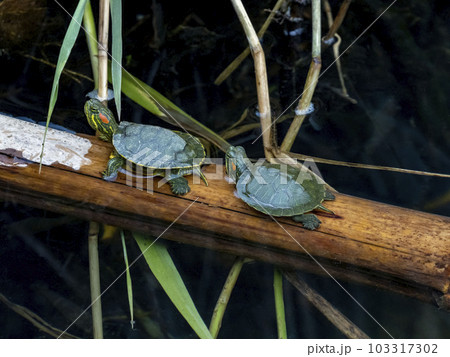 流木の上にいるミシシッピアカミミガメ