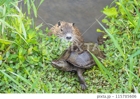 用水路のアカミミガメとヌートリア